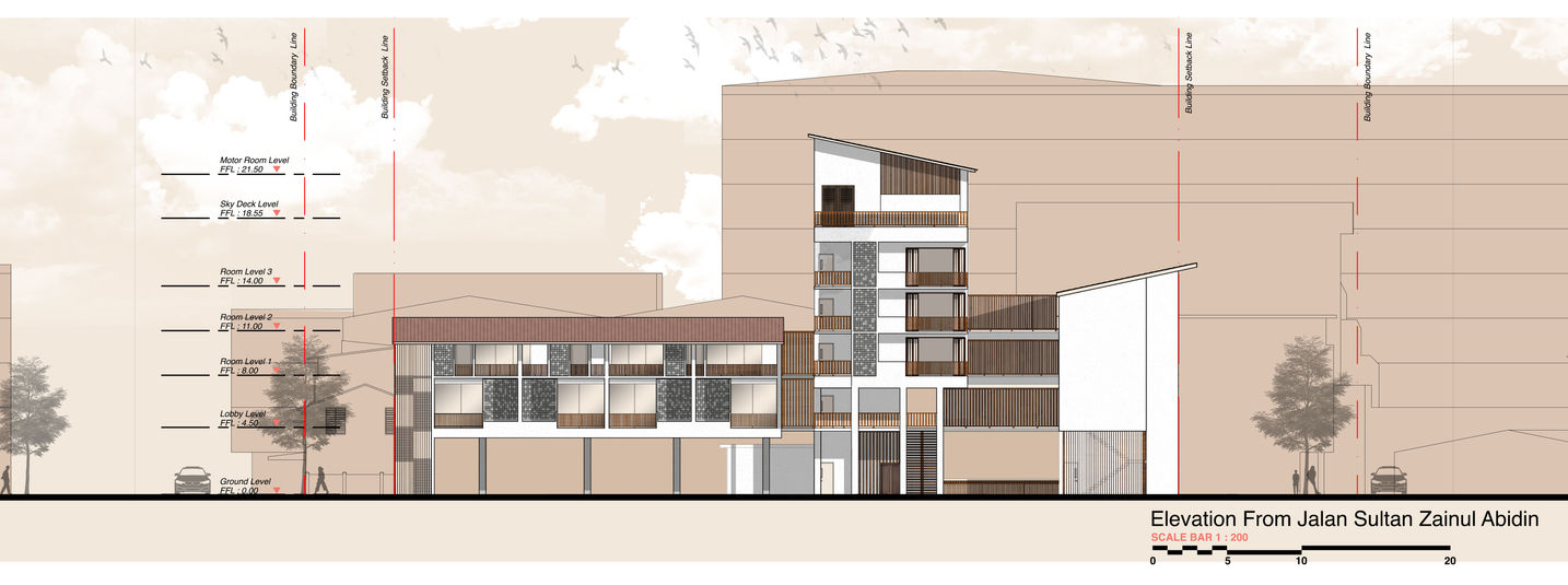 Sustainable ideas were implement into the design of hotel to cope with the sustainable topic of the assessment while trying the best to create a low-E emission building that able to minimize the damage impact towards the nature.